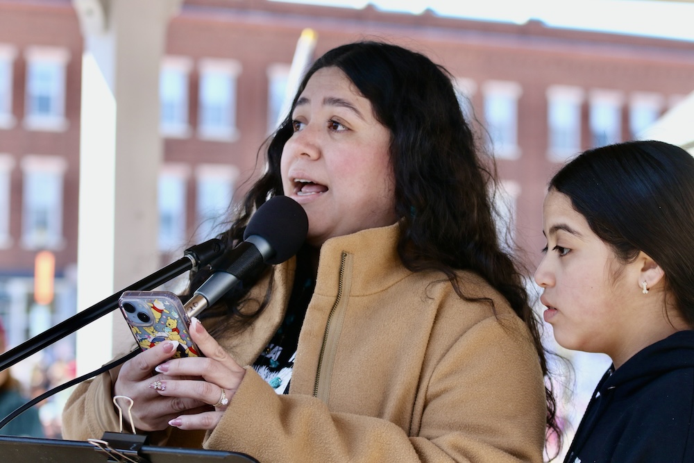 - Thelma Gomez of the group Migrant Justice exhorts citizens to protest actions of ICE agents against immigrants in Middlebury on Saturday, March 28, 2026. Independent photo/Steve James