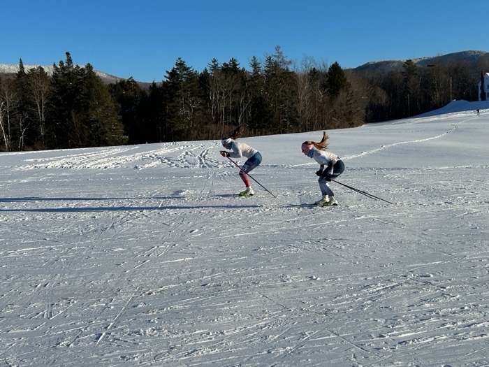 - Ponytail flying Former Middlebury Union High School teammates Ava Schneider, left, of Middlebury and Beth McIntosh of Ripton practice sprints in the meadow at Rikert Outdoor Center this past Sunday. Both athletes are first-year competitors of their respective college Nordic ski teams — McIntosh at Middlebury and Schneider at Dartmouth. Independent photo/Angelo Lynn