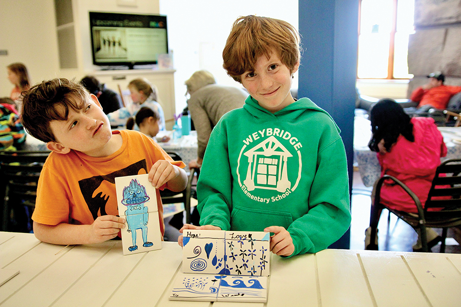 - FELLOW WEYBRIDGE RESIDENTS Benny Wilhelm, 8, (left) and Sam Weir, 9, had slightly different approaches when they created decorative tiles at this past Saturday’s “Family Fun Day” at Middlebury College’s Mahaney Arts Center. Looks like one took a figurative approach, and the other went for an abstract design. Independent photo/Steve James