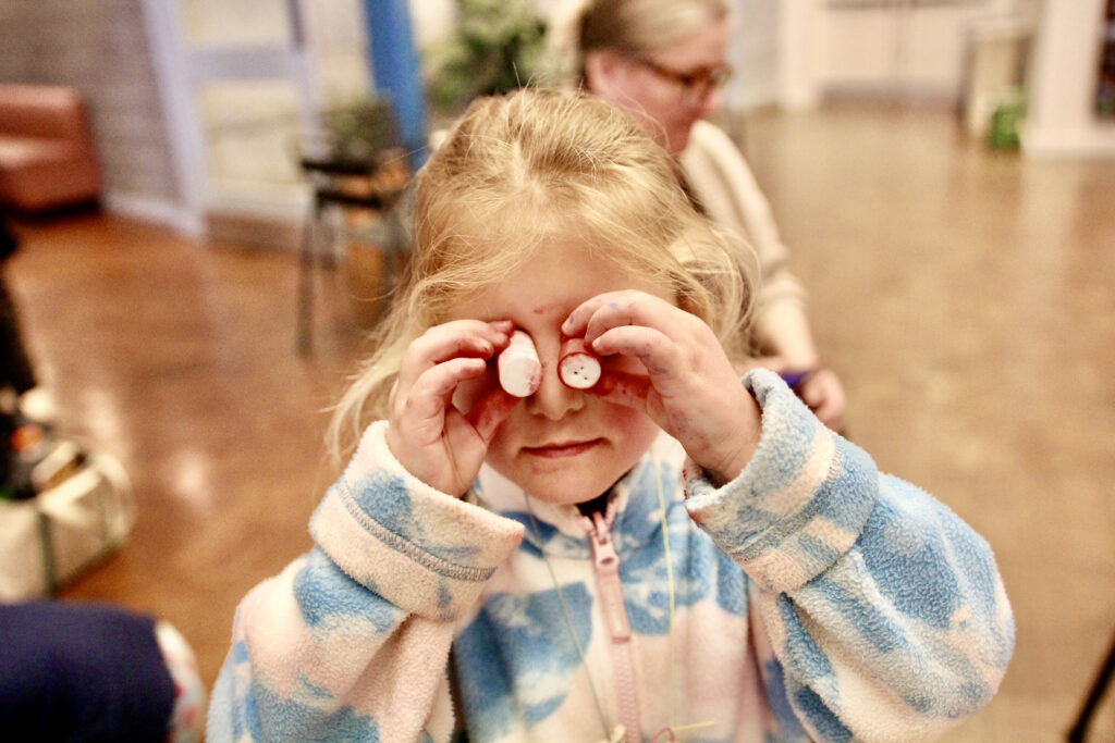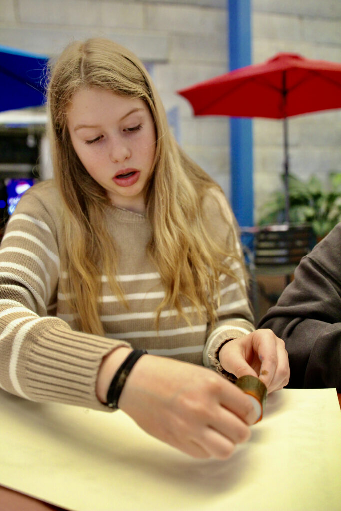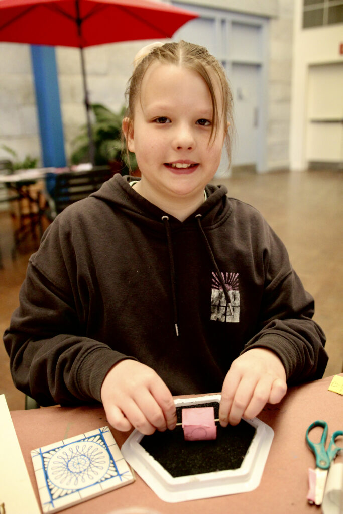 - LOCAL YOUNGSTERS LIKE seven-year-old Ingrid Grandusky of Salisbury on Saturday got to view works from Middlebury College’s Museum of Art and then let that inspire them to make their own creations. Grandusky paused to greet a photographer while clipping some paper for her art piece. Independent photo/Steve James