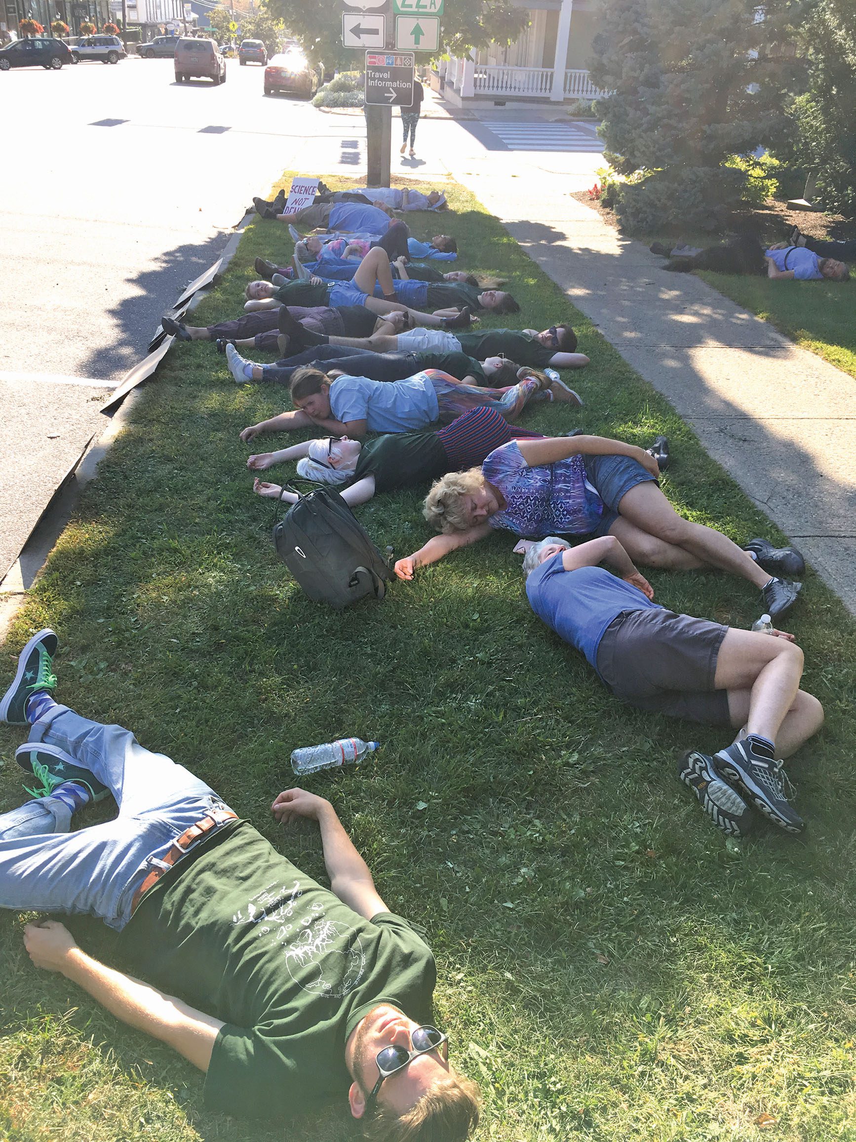 After the final bell rang on Friday, they led dozens of people, including members of the community and Rep. Lanpher, to the Vergennes City Green,. There they staged a rally and “die-in” where participants laid down on the grass pretending to be dead as a symbol of the impending doom that climate change could wreak.