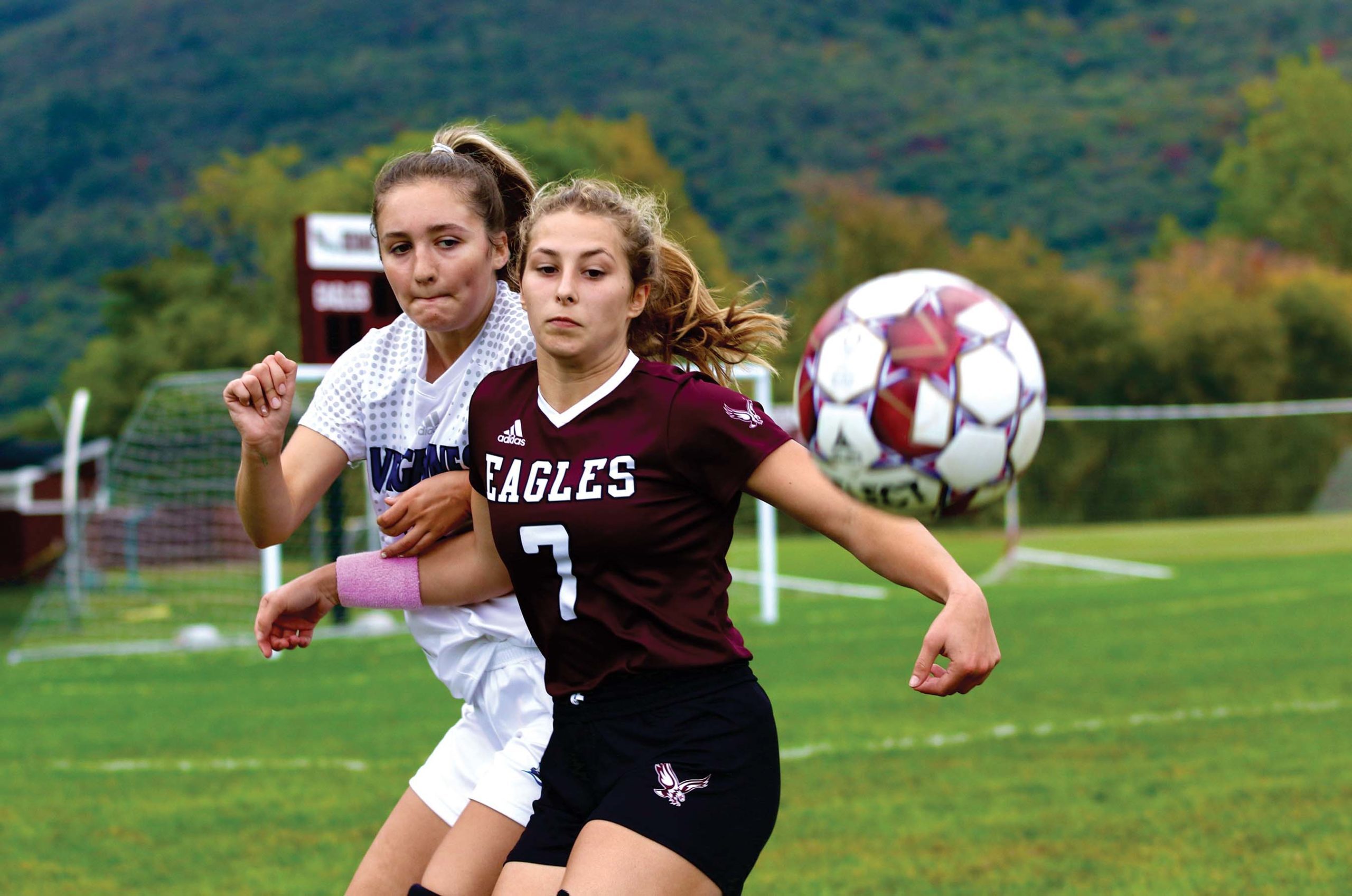 EAGLE BACK ANNIE Dufault battles with Commodore forward Felicia Poirier for control of the ball in the second half of Mount Abraham’s 2-0 home win on Tuesday. Mount Abe scored twice after intermission. Independent photo/Steve James