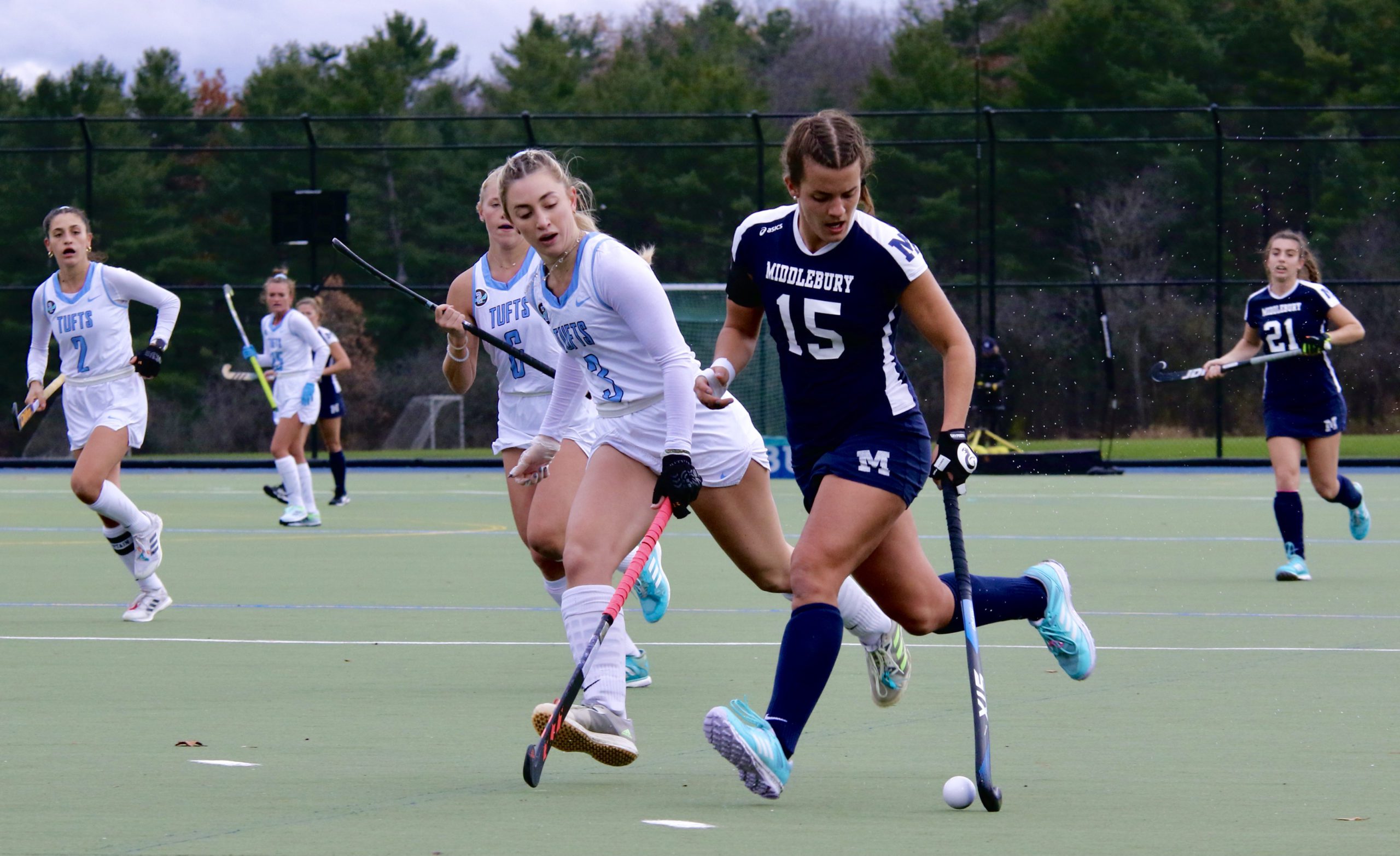 MIDDLEBURY FORWARD KATIE George goes on the attack during the Panther field hockey team’s 2-0 NCAA D-III tournament win on Sunday over Tufts. George scored in Middlebury’s 5-1 win on Saturday over Endicott.