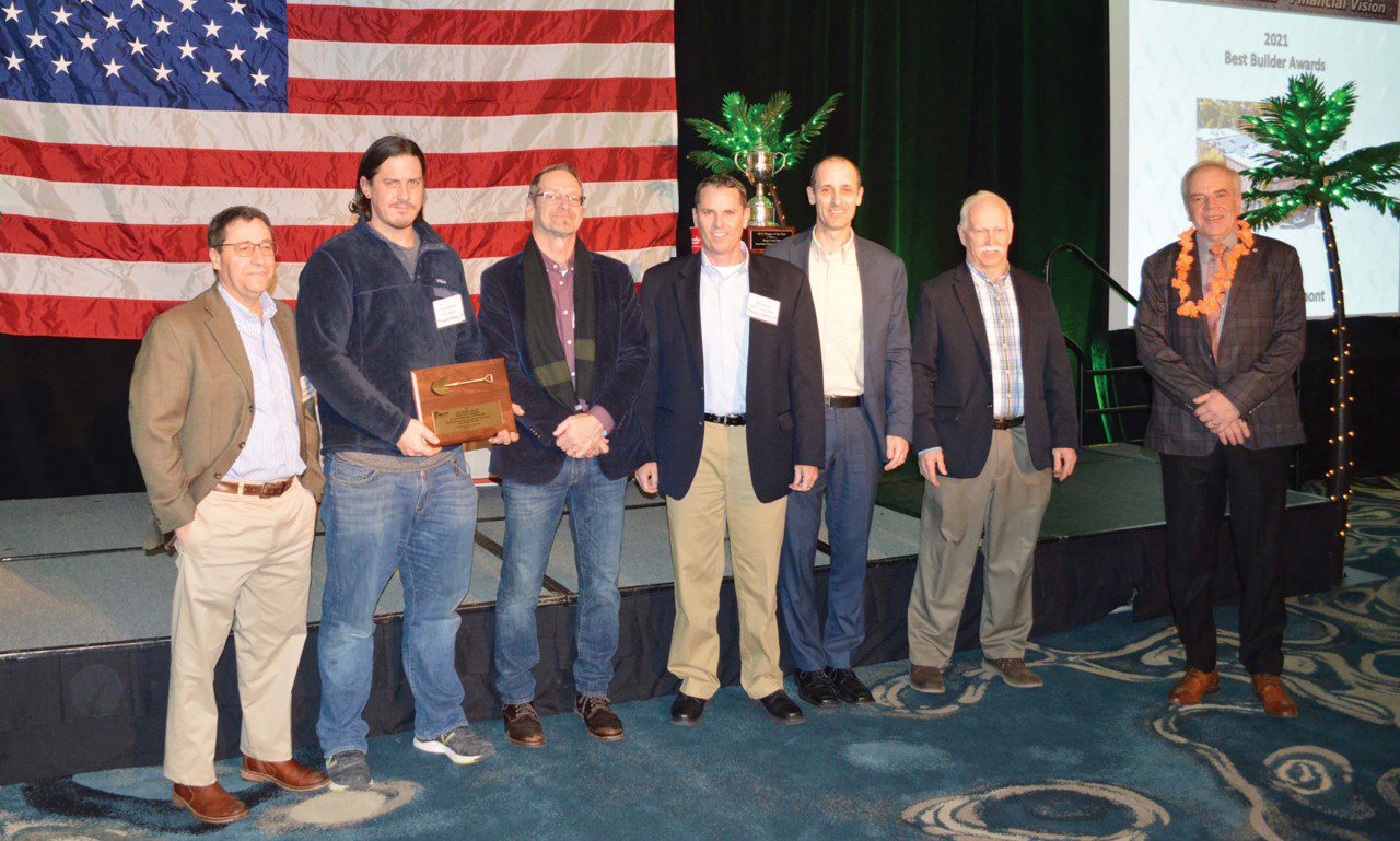 A TEAM FROM Bread Loaf Corp. accepts an award for its work rehabilitating blighted buildings in Bennington. Shown accepting the 2021 Best Builders Award for Outstanding Quality of Work and Effort are, from left, John Johnston, Jonathan Perkins, Paul Wyncoop, Michael McLaughlin, Fred Bellucci and Mike Deslandes, along with Richard J. Wobby Jr., executive vice president of Associated General Contractors of Vermont, which gave the award