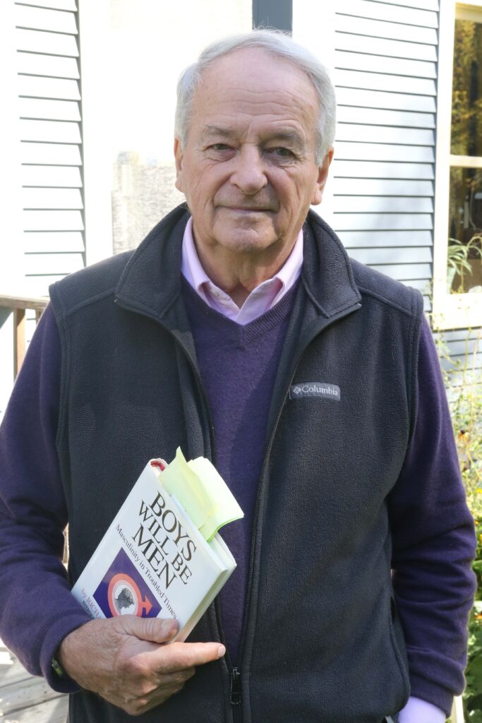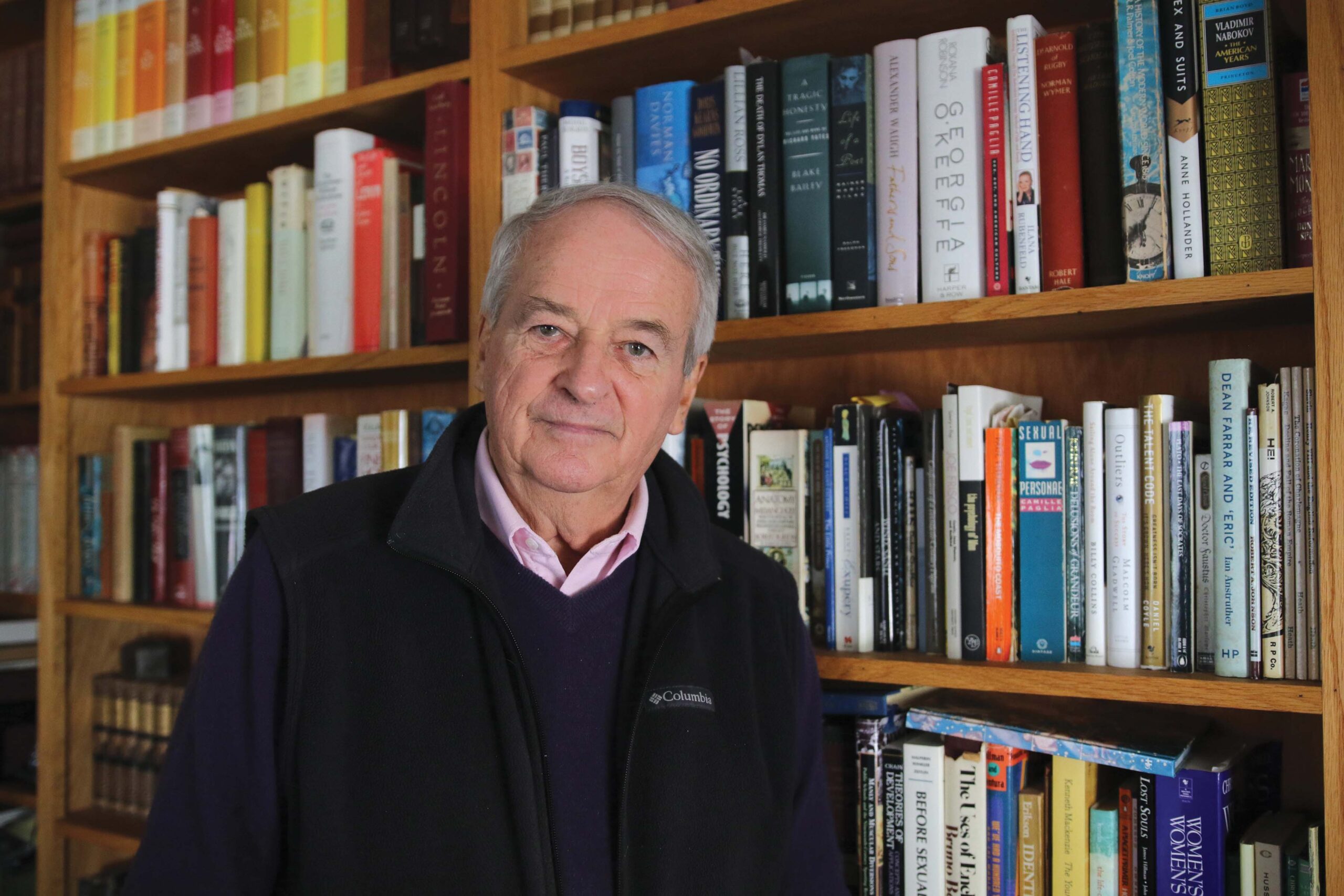 RICHARD HAWLEY OUTSIDE his Ripton home with one of the many books he has written.