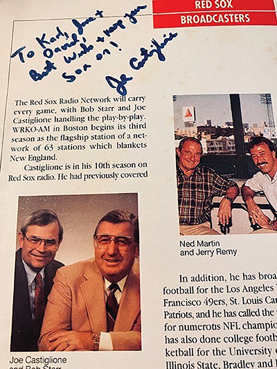 WHEN RED SOX Hall of Fame announcer Joe Castiglione visited Middlebury with his son in 1991 looking at colleges, he met with the columnist, who located (without difficulty) in his office a Red Sox program for Joe to sign.