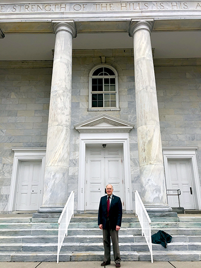 FORMER VERMONT GOVERNOR Jim Douglas stands outside the Middlebury chapel. Independent photo/Marin Howell