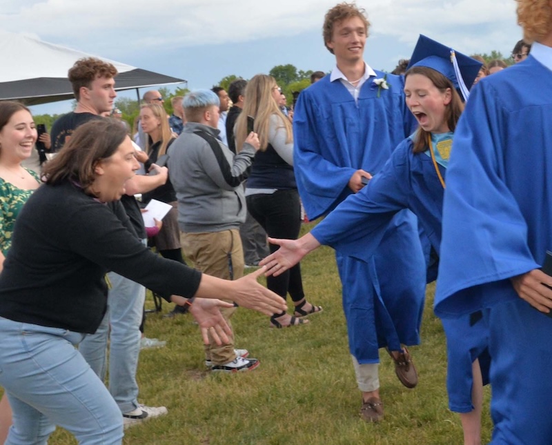 WITH DIPLOMA IN hand, Bea Eckels gets a big congratulations from an admirer as she walks with fellow VUHS grads out of their commencement ceremony on June 9. She is headed off to Boston and Simmons University at the end of the summer. Independent photo/John S. McCright