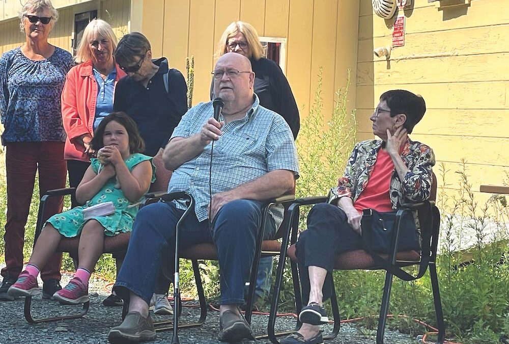 STEVE DOW ADDRESSES a crowd of around 100 people as his wife, Beth, listens at a celebration of their lengthy stewardship of Steve’s Park Diner. The Saturday morning event took place in the alley between the old Diner at Town Hall Theater. The former restaurant building is slated to be removed from its 66 Merchants Row location this Friday, Aug. 11, to make way for a THT addition.