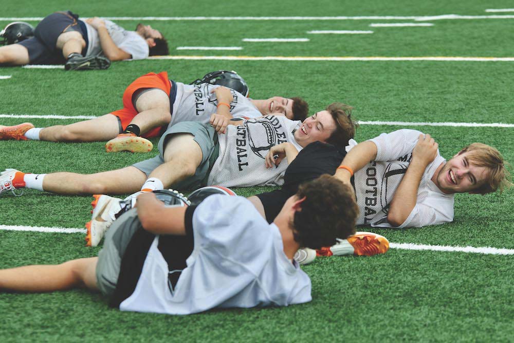MEMBERS OF THE Tiger football team enjoy stretching out on Middlebury College’s turf field last week. The team has been practicing there while Doc Collins Field — hopefully — dries out.