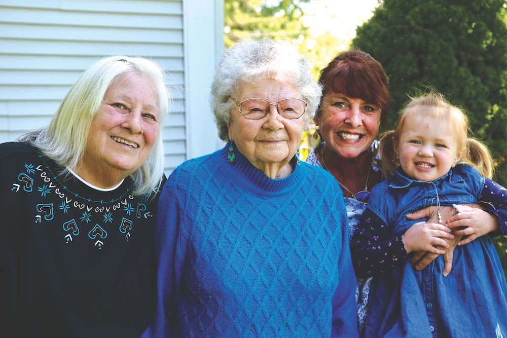 KATE CLIFFORD, SOON to turn 101, poses outside her Vergennes apartment for a picture with the youngest of her eight children, Connie Gilbert, left; one of her 15 grandchildren, Lisa Demilt, right; and one of her 24 great-grandchildren, Juniper Durfee, in Demilt’s arms.