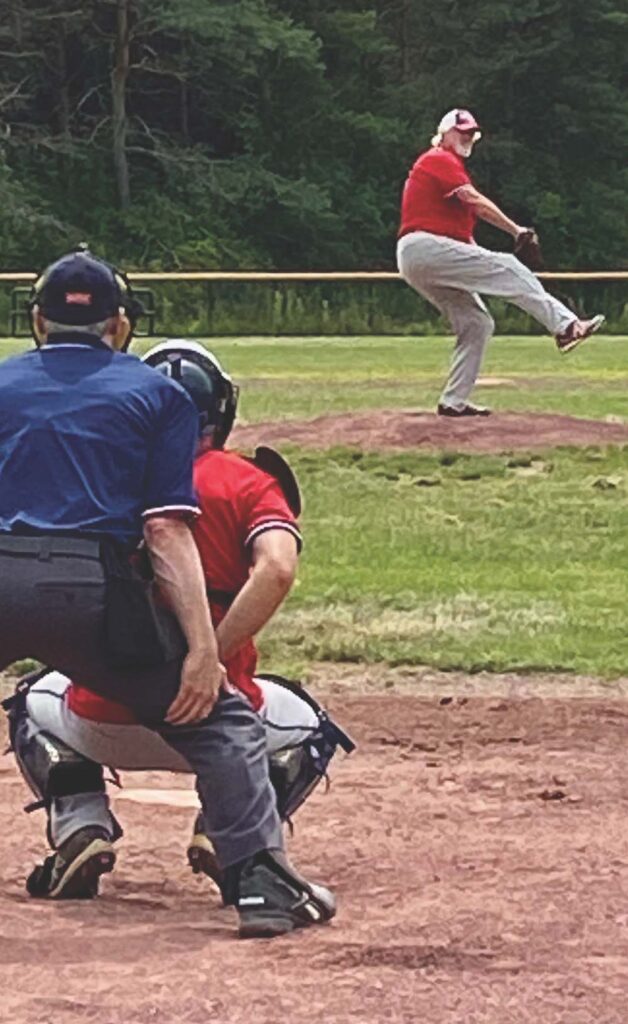 BILL LEE PITCHING for his Vermont club, the Burlington Cardinals, at the ballyard in Charlotte in 2022. In that season, Bill, at 75, threw the most innings of any pitcher in the Vermont Senior (over 35) League using that “old rocking chair motion.”