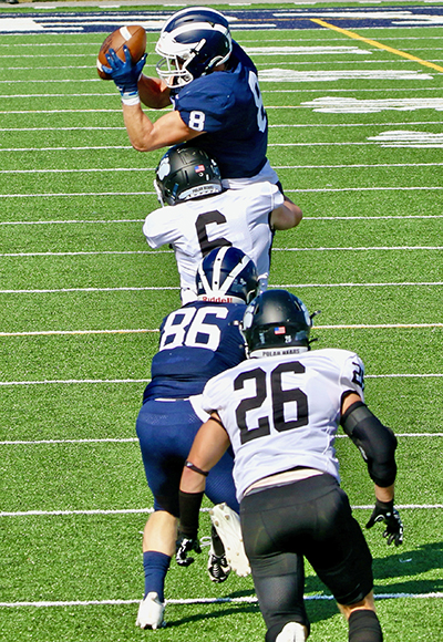 MIDDLEBURY WIDEOUT MIKE Ahonen goes high to make a catch during the Panther football team’s victory over visiting Bowdoin on Saturday.