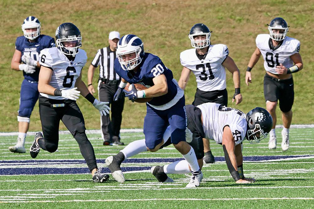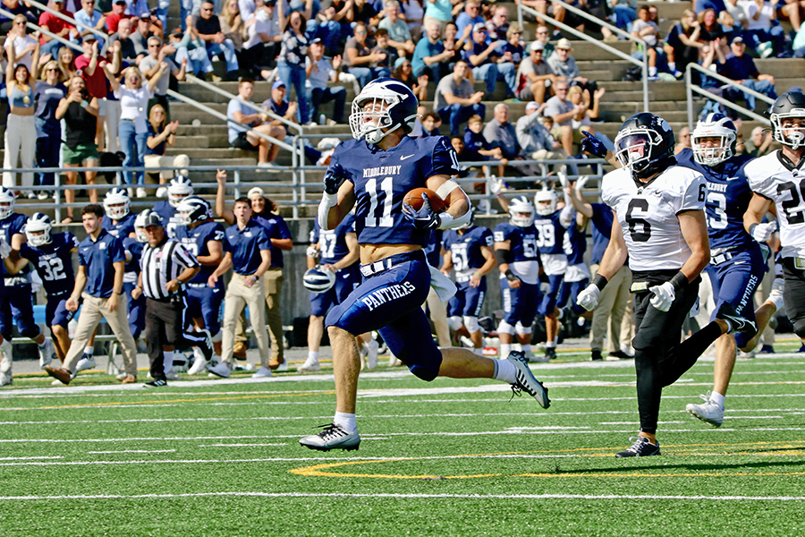 PANTHER RUNNING BACK Walker Coleman leaves would-be tacklers in the dust during a 51-yard TD ramble on Saturday, when the Middlebury College football team defeated visiting Bowdoin, 34-27.