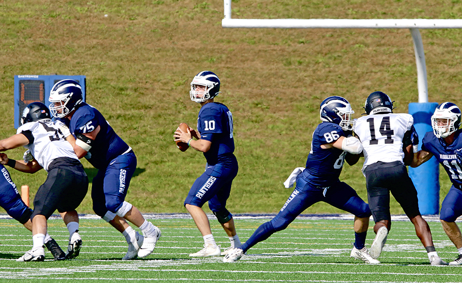 PANTHER QB COLE Kennon surveys the field behind good blocking during Middlebury College’s Saturday home game. Kennon tossed three touchdown passes in the Panther win.