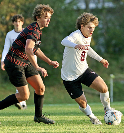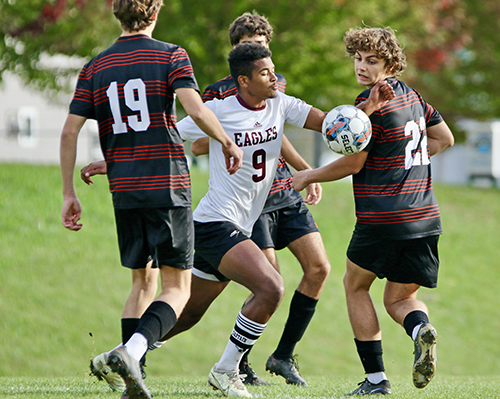 EAGLE MIDFIELDER NOAH Ladeau makes a move up the field during Friday’s game at MUHS, won by the host Tigers.