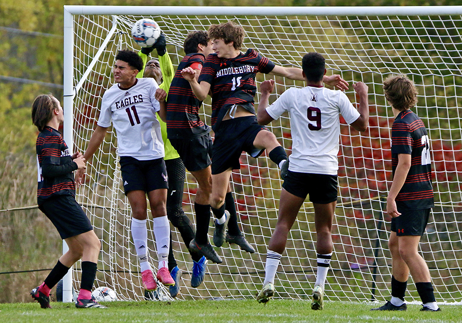 TIGER GOALIE JONATHAN Kafumbe punches away a Mount Abe free kick in a goalmouth crowd, including Eagle Liam Lazare (No. 11), during Friday’s game at MUHS.
