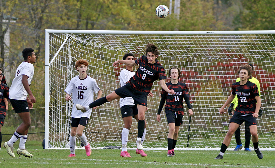 EAGLE MIDFIELDER JAMES Graziadei watches his header go high into the net for the Mount Abe score at MUHS on Friday.