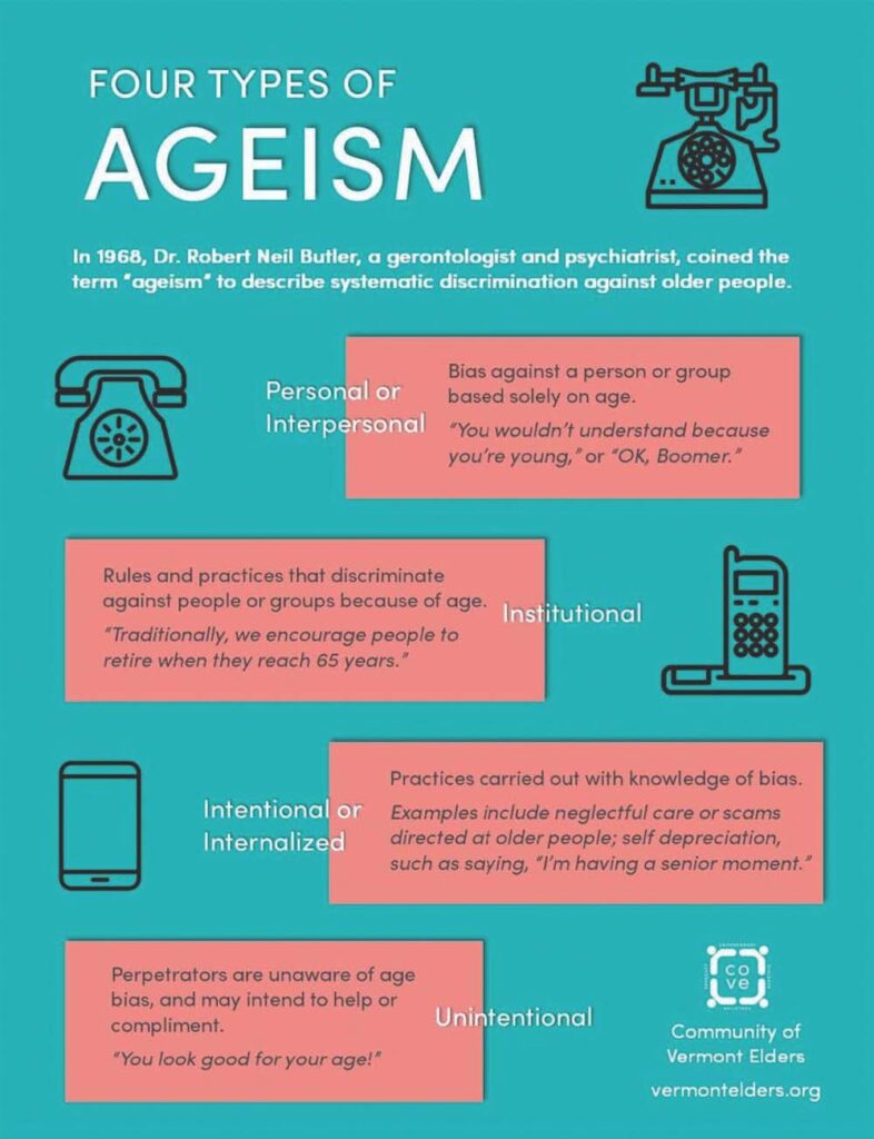 Ageism refers to stereotypes (how one thinks), prejudice (how one feels) and discrimination (how one acts) toward others based on age, and it is the most widespread and socially accepted form of prejudice. An estimated 183,157 older adults — those over the age of 60 — live in Vermont, which makes this group our fastest growing demographic in the state and for whom this prejudice of ageism is lived daily.