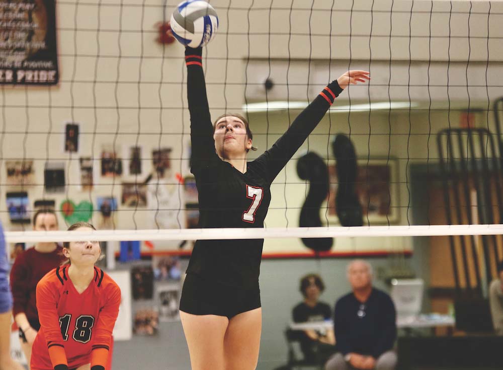 ADDISON COPELAND MAKES a play at the net for the MUHS volleyball team during its win on Tuesday. Copeland was one of two seniors the team honored that evening.