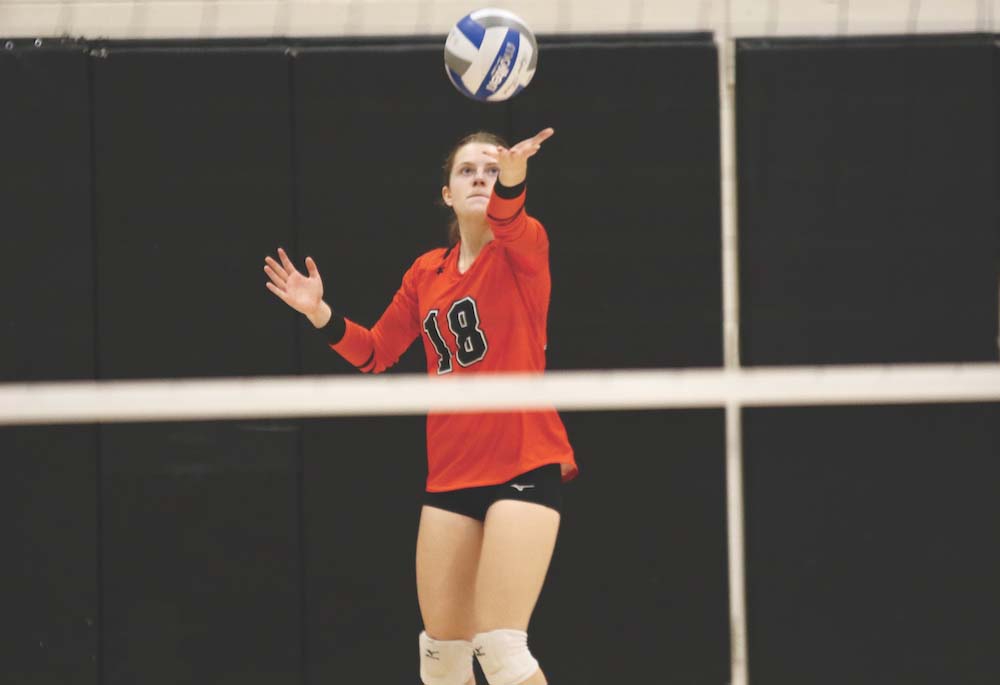 JUNIOR EMMA MORRISEY lines up a serve on Tuesday evening, when the MUHS volleyball team defeated visiting Missisquoi to improve to 12-1.