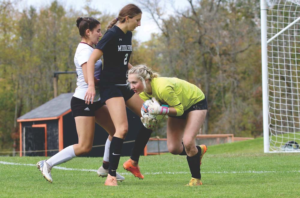 TIGER GOALIE KASSIDY Brown comes off her line during Saturday’s game at MUHS to snuff out an Eagle threat while Tiger center back Meredith Horne shields and Eagle attacker from the play. The Eagles won in overtime.