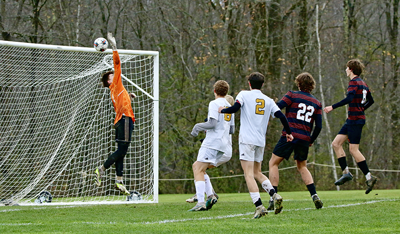 TIGER SENIORS MILO Rees (#22) and Iver Anderson hunt a rebound as teammate Oliver Choudhury’s long second half direct kick bounces off the Harwood crossbar during the D-II semifinal on Nov. 1.