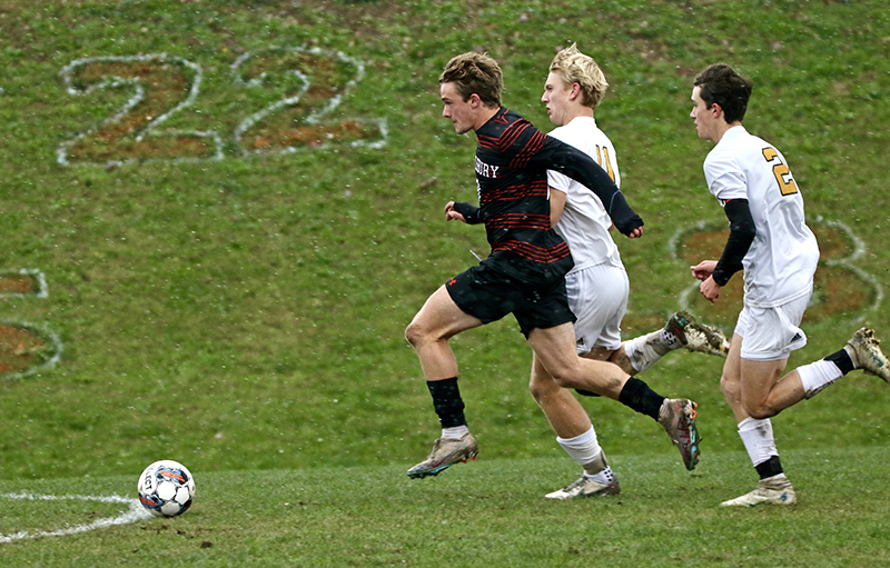 TIGER SENIOR STRIKER Eddie Fallis bursts past two Harwood players on the way to scoring a breakaway goal. Fallis scored twice in the Tigers’ 4-3 Division II semifinal loss to Harwood on Nov. 1.