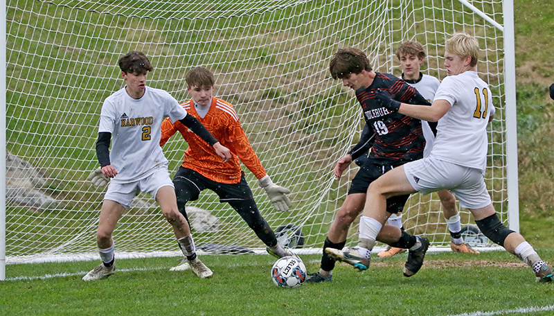 MUHS SENIOR MIDFIELDER Iver Anderson battles for the ball with defenders in front of the Harwood goal during the Division II seminal on Nov. 1.