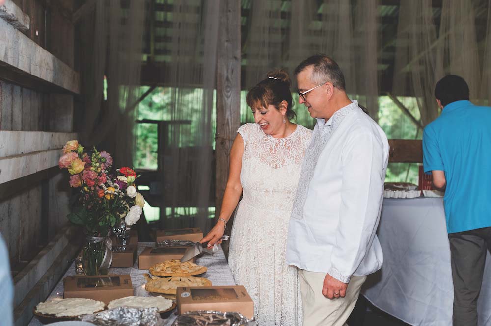 Prior to the ceremony there were various beverages and hors d’oeuvres. Beverages were served in an aluminum canoe, and bottles of Gary’s own wine were on each table. Dinner was served buffet style, featuring Pratt’s for catering. Instead of the traditional wedding cake, they had a dessert buffet filled with various pies. Gary and Mary Beth chose to cut into an apple pie, because, the bride said, he had won her over with an apple pie years earlier. The bride’s sister Louise and the groom made a majority of the pies, though they also purchased some berry pies from Pratt’s because they find them so delicious. A friend made incredible cupcakes with fresh raspberry filling, coconut macaroons and another made Baklava.