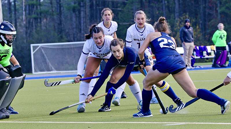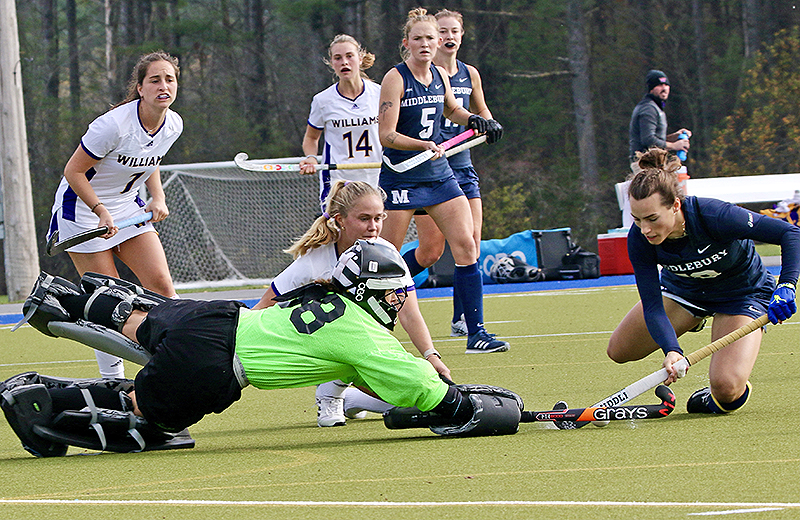 WILLIAMS GOALIE GATES Tenerowicz sprawls to deny Panther Katie George on this play, but George notched one of the Middlebury’s field hockey team’s four goals in their NESCAC final in on Sunday.