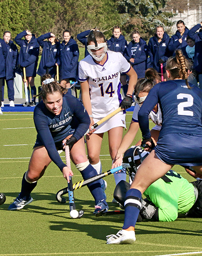 MIDDLEBURY ATTACKERS LILLY Branka, with ball, Audrey Lazar (#2) and Katie George swarm the Williams cage during the Panther field hockey team’s 4-0 NESCAC final win on Saturday.
