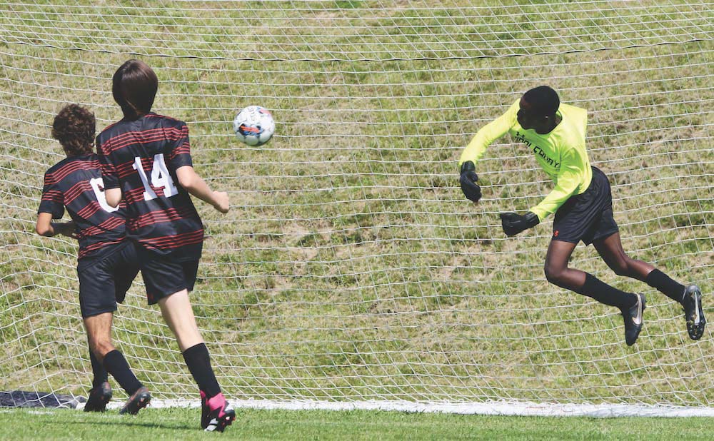 TIGER SOPHOMORE GOALIE Jonathan Kafumbe flies through the air to make a save on a Rutland shot during the Tigers’ home game on Sept. 2.