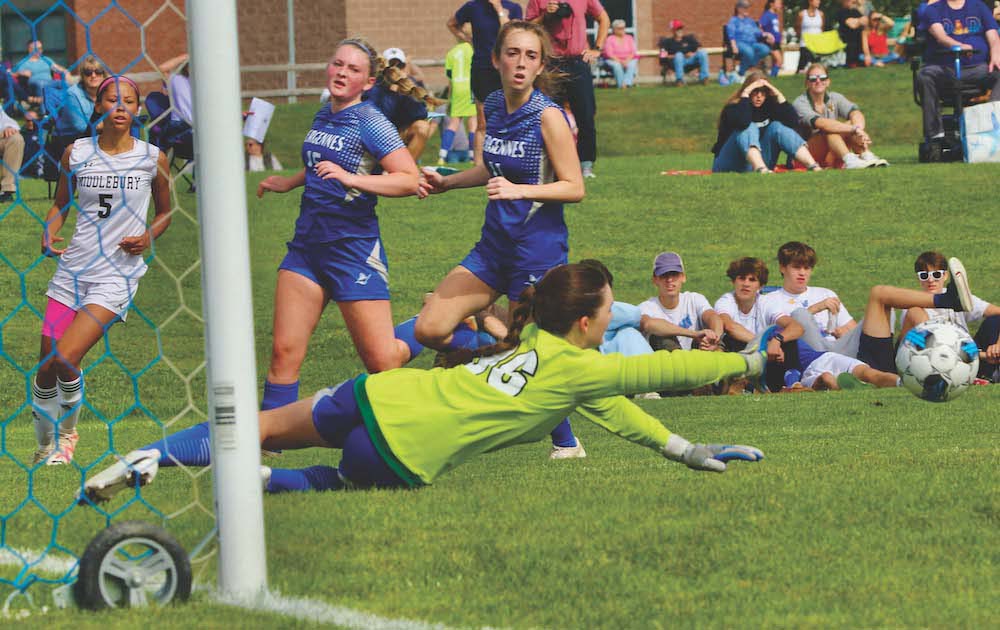This photo below has it all. Vergennes goalie Quincy Sabick is making an athletic dive to knock away a dangerous cross. Commodore backs Siobhan Potter and Alaina LeBeau are on the scene, but are still concerned about the outcome of the play. Meanwhile, the author of the threat, Tiger forward Jazmyn Hurley, is still hopeful as she checks out the results of her effort.