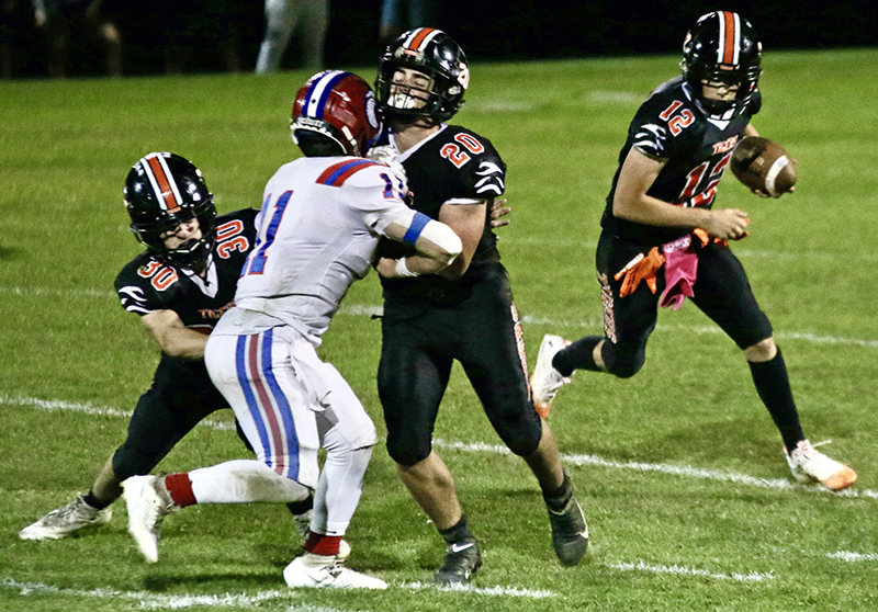 TIGER QB JACOB Kemp gains key yards late in the first half of an Oct. 6 game against Hartford behind a big block from back Gavin McNulty (#20).
