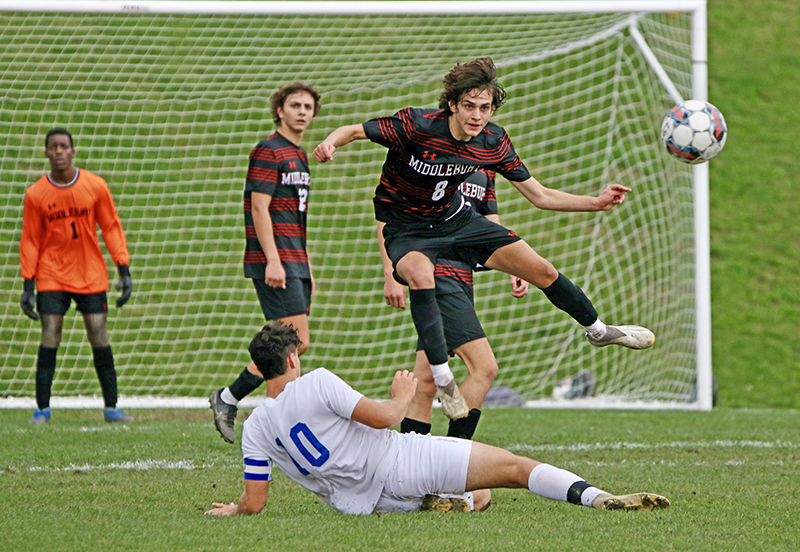 TIGER STRIKER EDDIE Fallis hurdles over at attempted tackle by Eagle midfielder Noah Ladeau during an October game at MUHS, won by the host Tigers. Fallis, as usual, had a goal and an assist: He finished with 27 goals and 23 assists this season.