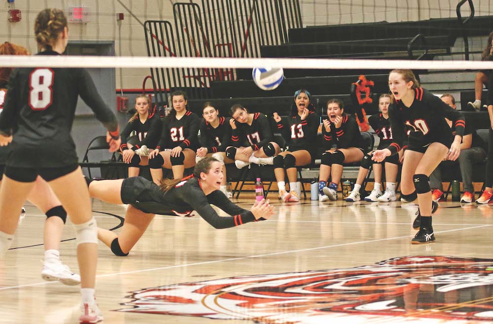 TIGER SENIOR CAPTAIN Sienna Rubright dives to keep a point alive during the Tigers’ home volleyball quarterfinal on Oct. 26 vs. St. Albans.