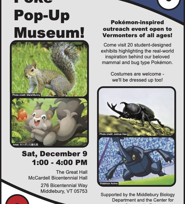 The pubic is invited to come visit a “Pokémon Pop-Up Museum” in the Great Hall of the McCardell Bicentennial Hall at Middlebury College this Saturday, Dec. 9., 1-4 p.m.