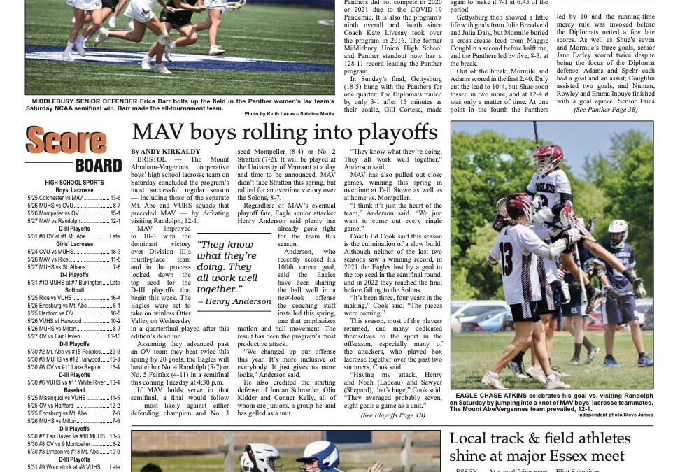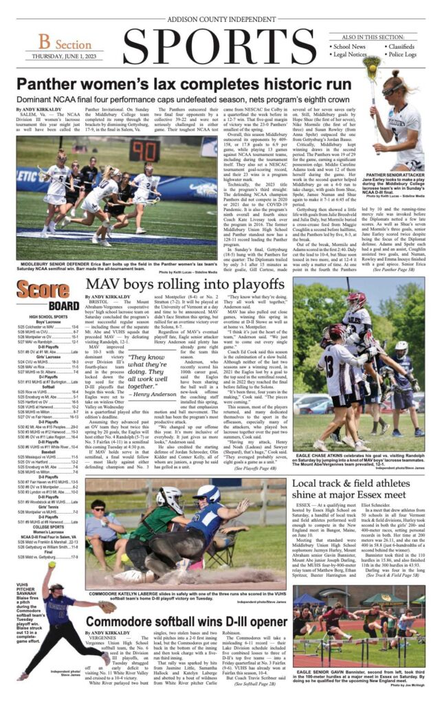 THE FRONT PAGE of the Addison Independent sports section on June 1, 2023