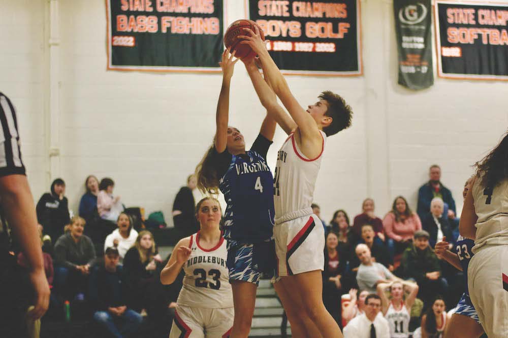 TIGER SOLSTICE BINDER goes up high for a rebound hotly contested by Commodore Ava Francis on Saturday at MUHS, in a close game won by VUHS.