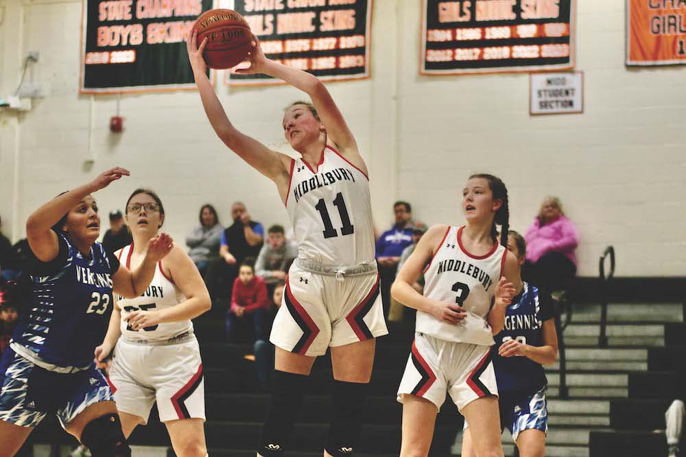 MUHS JUNIOR KASSIDY Brown hauls down a rebound during Saturday’s game in Middlebury as Commodore Kendra Jackson, left, and Tiger Isabel Quinn look on.
