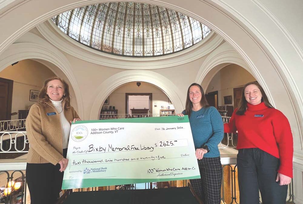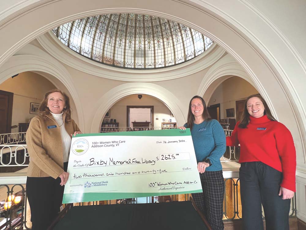 CATHARINE HAYS, MARY Neffinger and Amber Lays of Bixby Memorial Free Library in Vergennes will use funds donated by 100+ Women Who Care of Addison County for accessibility upgrades at the library.
