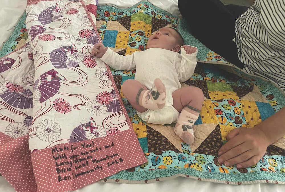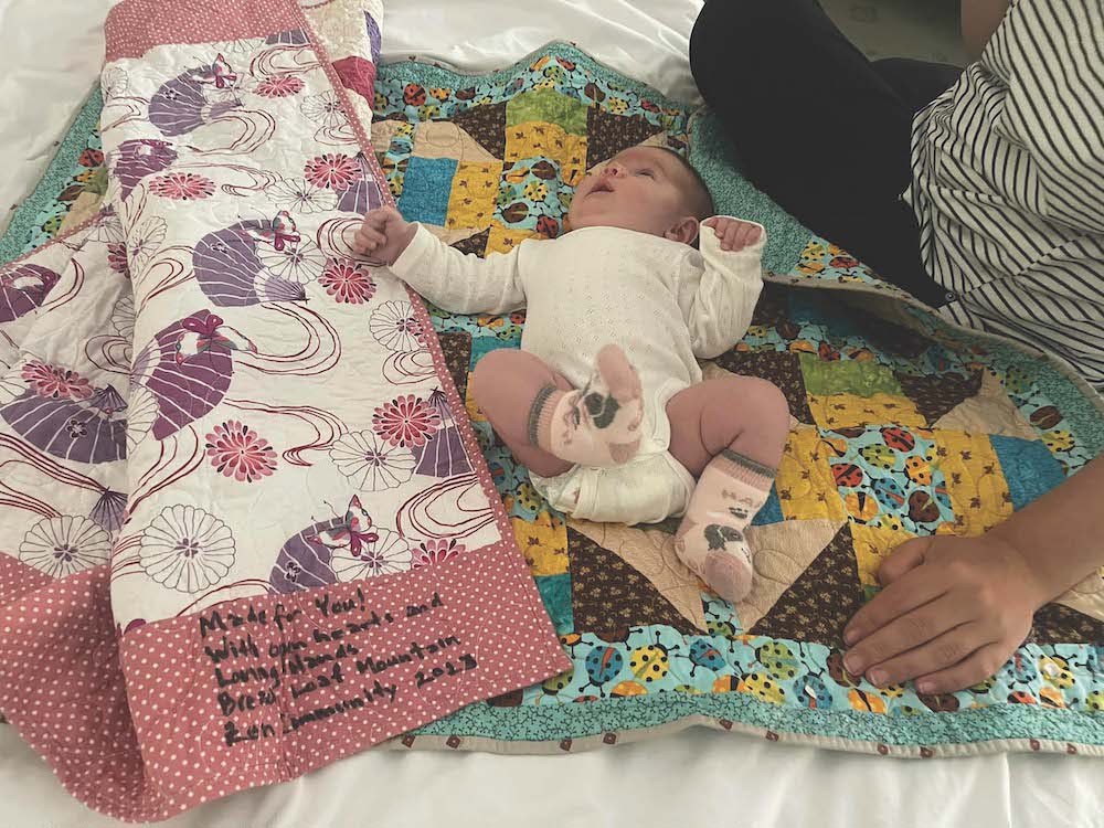 A UKRAINIAN INFANT enjoys a quilt generated by volunteers involved in the Peacemaker Quilt Project. The project provides homemade quilts to children going through difficult times, ranging from war to foster care.