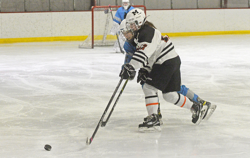 The Tigers also have been getting good goaltending. South Burlington controlled Friday’s first period, outshooting the Tigers, 13-5, but MUHS surrendered only one goal as netminder Ruby Hubbell made a dozen stops. Hubbell, who finished with 23 saves, probably did her best work when holding her ground in a scrum with about four minutes to go, and then denying Hadia Ahmed from the high slot just afterward.