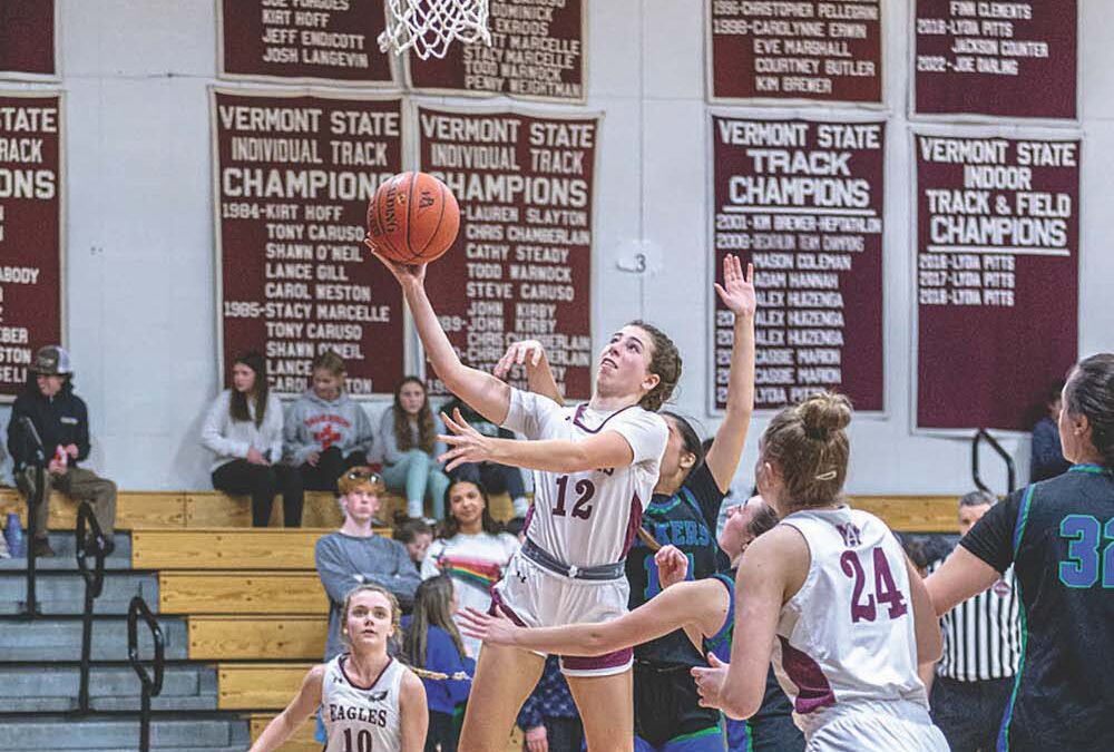 EAGLE SOPHOMORE GEN Forand cruises in for a layup during the Mount Abe girls’ basketball team’s Tuesday game in Bristol.