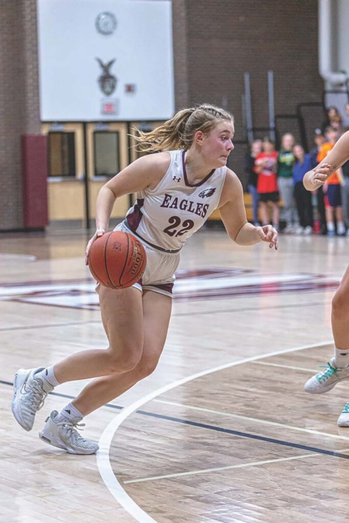 EAGLE JUNIOR GUARD Hazel Guillmette drives into the paint during the Eagle girls’ basketball team’s Tuesday home game vs. Colchester.