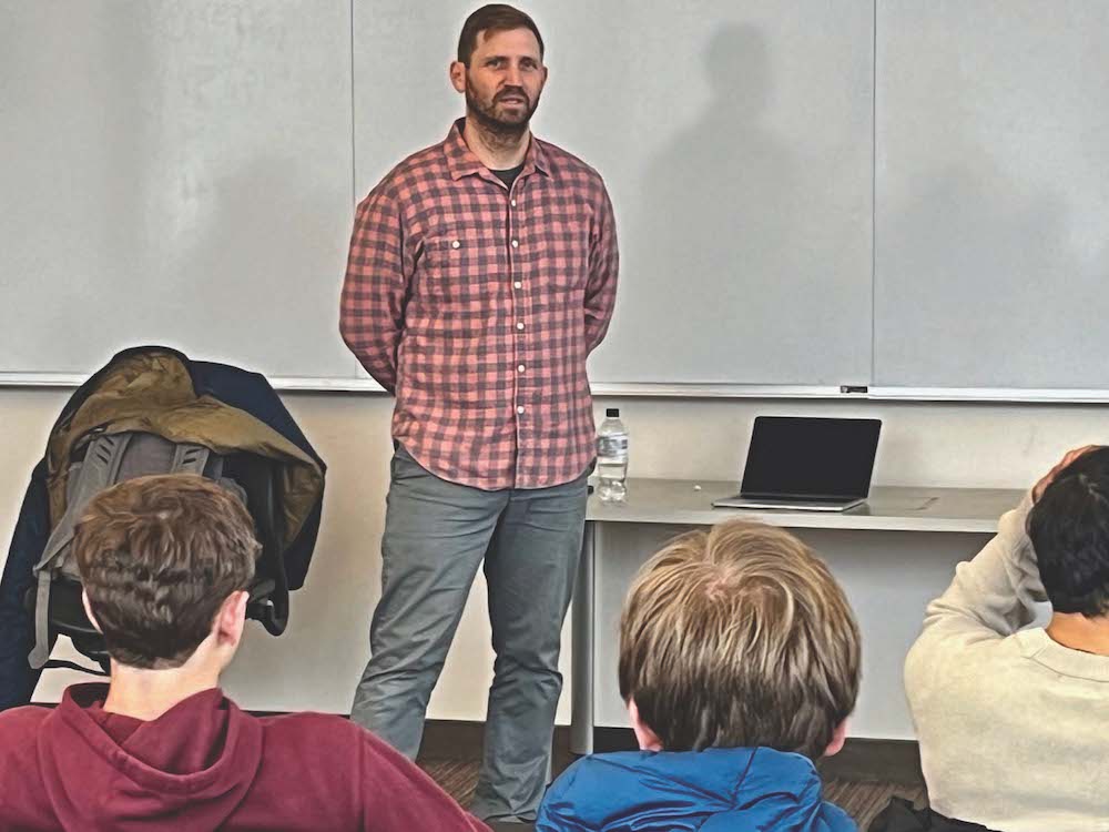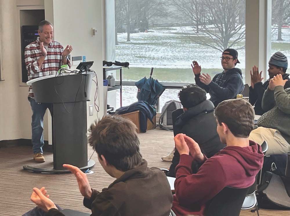 SCOTT LANGERMAN, MIDDLEBURY College alum (1987) and parent, enjoys a moment with the class in the course he taught with Middlebury baseball coach Mike Leonard in January’s Winter Term.
