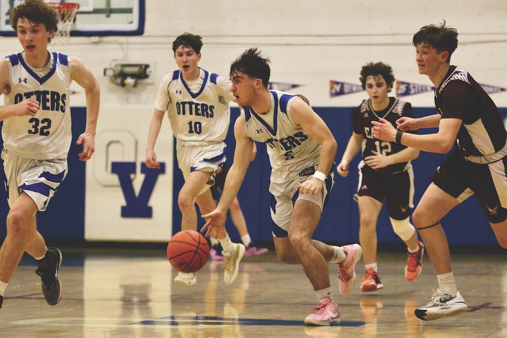 OV SENIOR AIDEN Decker, flanked by classmate Owen Thomas on the left, leads the Otters in transition against Mount Abe during Tuesday’s D-II playoff game in Brandon.