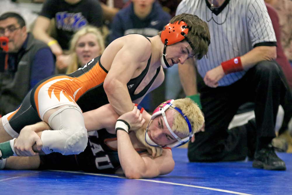 TIGER AVERY CARL has the upper hand against Mount Anthony’s Shaun Gassaway in his victory in their 144-pound semifinal on Saturday at the state championship tournament at OV. The second-seeded Carl ended up second.