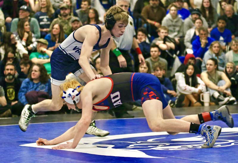 VUHS JUNIOR ISAAC Preston goes for one of his four straight pins, this one vs. Burr & Burton’s JT Wright in a Saturday semifinal. Preston earned the 190-pound title at the Vermont championship tournament at OV.